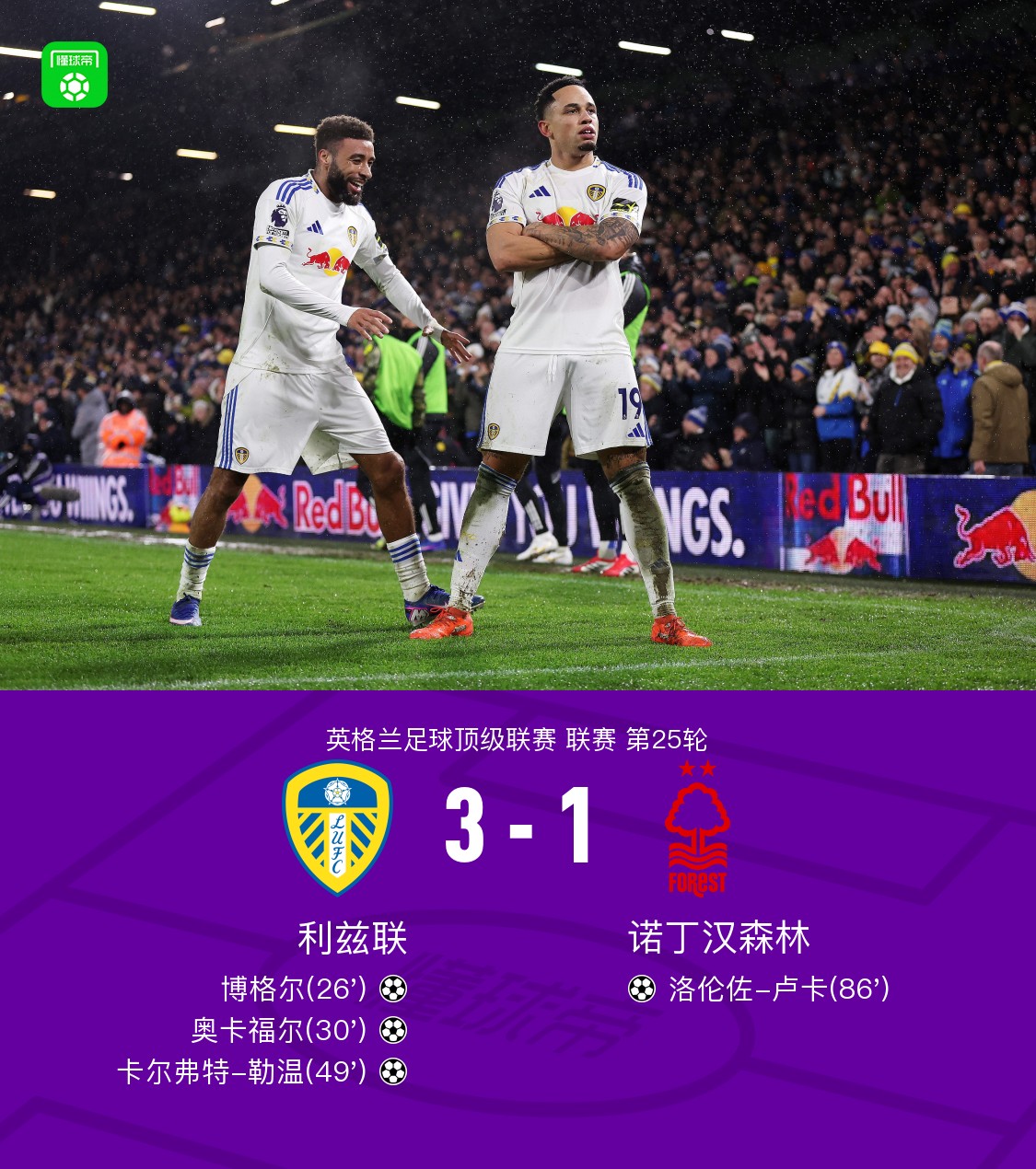 北京时间2月7日英格兰足球顶级联赛联赛第25轮,利兹联主场对阵诺丁汉森林。利兹联博格尔破门,奥卡福尔破门,卡尔弗特-勒温破门。诺丁汉森林洛伦佐-卢卡破门。最终比分利兹联3-1诺丁汉森林。点击查看本场比赛详细数据>>点击查看英超完整积分榜>>关键事件第26分钟,格鲁耶夫长传身后,博格尔插上破门先拔头筹,利兹联1-0上咪咕独家看英超第30分钟,贾斯廷助攻,奥卡福尔推射破门,利兹